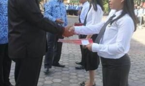 Samosir, POL | Bupati Samosir, Rapidin Simbolon menyerahkan SK CPNS sebanyak 250 orang yang terdiri dari tenaga guru sebanyak 150 orang, tenaga kesehatan 73 orang, dan tenaga teknis 27 orang pada Upacara Hari Kesadaran Nasional (HKN) di halaman Kantor Bupati Samosir, Senin (17/6/2019).