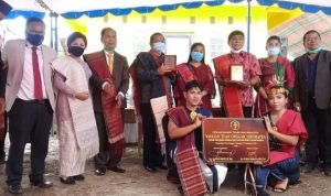 Samosir, POL | Bupati Samosir Drs. Rapidin Simbolon, MM bersama istri didampingi Wabup Samosir bersama istri menandatangani prasasti peresmian Yayasan Tuan Onggar Rumapea di Sibandol Desa Sipinggan Kecamatan Nainggolan-Samosir, Sabtu (12/09/2020).