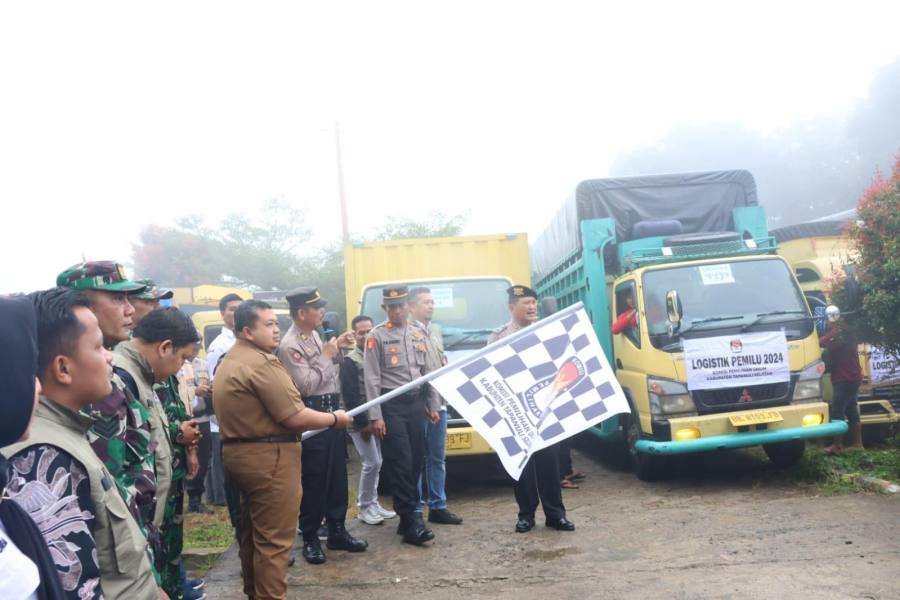Tapsel, POL | Bupati Tapanuli Selatan (Tapsel) Dolly Pasaribu melepas pendistribusian Logistik pemilu tahun 2024 ke 15 Kecamatan se-Kabupaten Tapsel dari halaman Kantor KPU Tapsel, Jalan Lintas Sumatera, Desa Situmba, Kecamatan Sipirok, Senin (12/2/2024).
