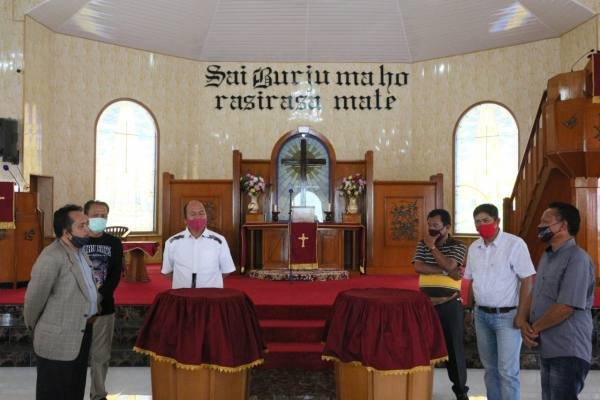 Bupati Nikson dan Forkopimda diterima oleh Pdt. Saor Hutagaol, STh selaku Pendeta Resort bersama para Pengurus Gereja menganjurkan agar pihak gereja harus menyepakati beberapa ketentuan dalam pelaksanaan tata cara beribadah yang berpedoman pada protokoler kesehatan Covid-19.
