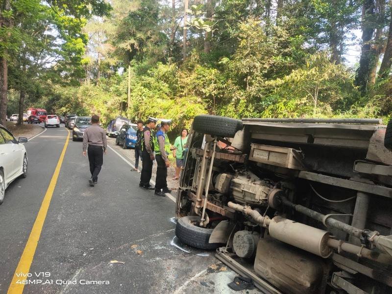Simalungun, POL | Sepuluh orang penumpang luka-luka hingga dilarikan ke rumah sakit setelah Bus PT Lalupa Karona yang mereka tumpangi terguling di Jalan Lintas Pematang Siantar-Parapat, KM 27-28, Harangan Ganjang, Nagori Pondok Bulu, Kecamatan Dolok Panribuan, Kabupaten Simalungun.