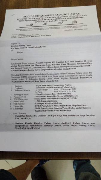 Padanglawas, POL | Tuntut cabut dan batalkan Undang-undang (UU) Omnibus Law Cipta Kerja dan stop kriminalisasi terhadap aktifis buruh, aksi demo buruh/pekerja tergabung di Federasi Serikat Pekerja Metal Indonesia (FSPMI) akan mewarnai Sibuhuan Ibukota Kabupaten Padanglawas (Palas), Provinsi Sumatera Utara atau Sumut, Senin (02/11/2020) mendatang.