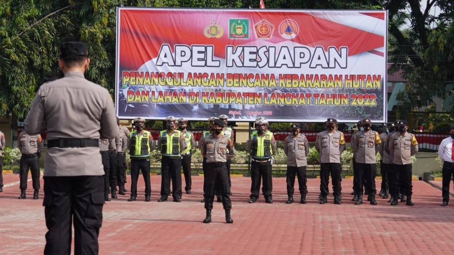 Langkat, POL | Polres Langkat menggelar apel kesiapan penanggulangan bencana kebakaran hutan dan lahan (Karhutla) di wilayah Kabupaten Langkat tahun 2022, di Lapangan Jananuraga Mapolres Langkat, Stabat, Jum’at (12/8/2022).