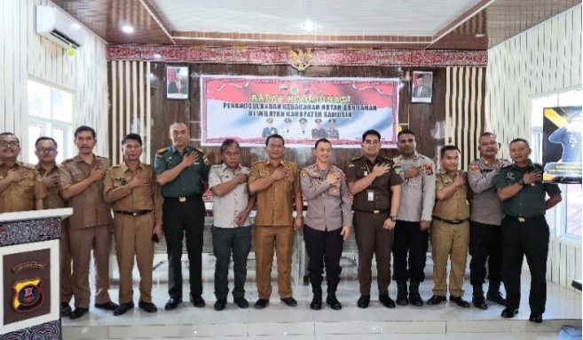 Samosir, POL | Forum koordinasi pimpinan daerah (Forkopimda) Kabupaten Samosir menggelar rapat koordinasi penanggulangan kebakaran hutan dan lahan (Karhutla) di Aula Wira Pinandita Polres Samosir, Selasa (27/06/2023).