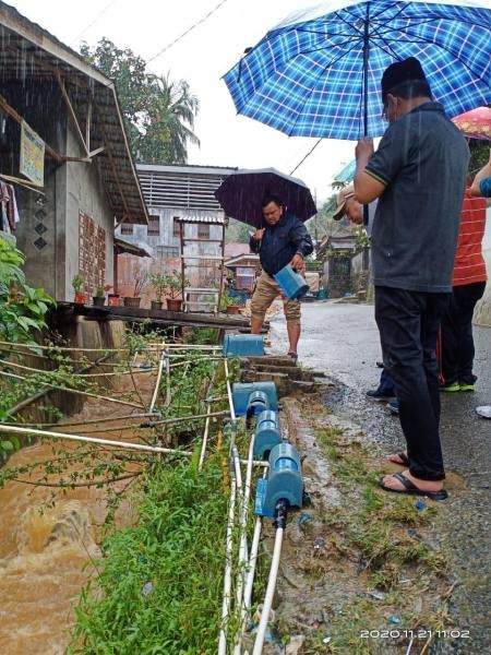 Dengan berjalan kaki sembari menggunakan payung, bersama petugas PDAM Wali Kota mengecek dengan detail satu persatu pipa jaringan air bersih yang bermasalah, untuk mengetahui pasti penyebab persoalan matinya air bersih, dan memastikan petugas memperbaiki jaringan yang bermasalah