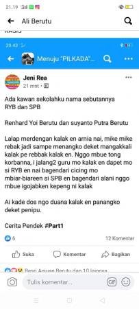 Pasalnya akun facebook diduga bernama Jeni Rea telah spontanitas ataupun sengaja memposting status di akun Facebok dan menshare di salah satu grup publik menuju Pilkada Pakpak Bharat 2020, yang diduga sengaja telah menuduh dengan nama samaran dan marga Berutu sebagai pencuri.