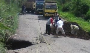 Simalungun, POL | Masyarakat Nagori Rayausang Kabupaten Simalungun, terpaksa kerja bakti menimbun badan jalan provinsi di kampung mereka, tepatnya di KM 42 P.Siantar – K.Jahe, yang terancam putus akibat longsor.