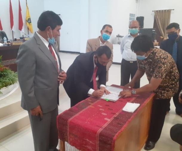 Penandatanganan dimaksud terlaksana setelah melalui pembahasan oleh Badan Anggaran DPRD bersama Tim Anggaran Pemerintah Daerah (TAPD) Kabupaten Samosir.