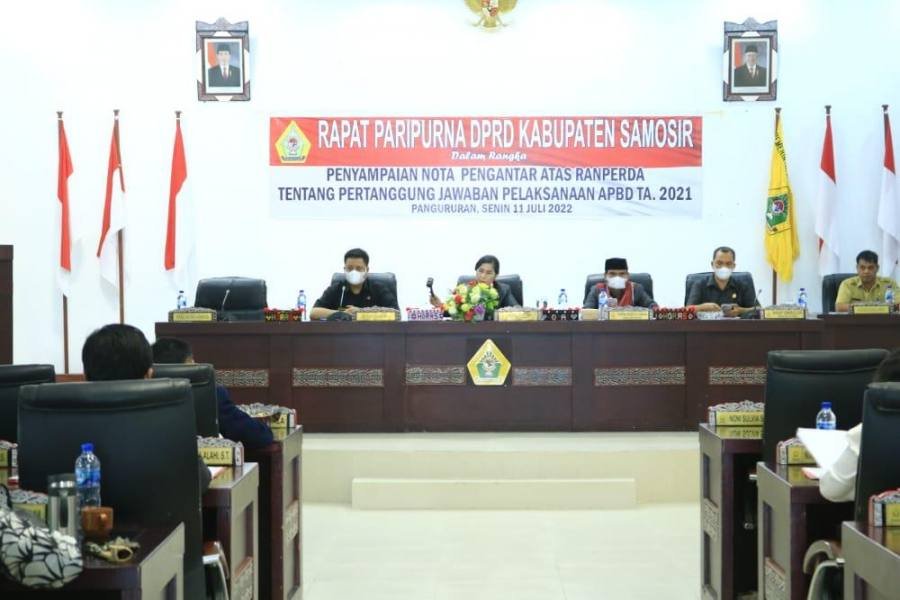 Samosir, POL | DPRD Samosir menggelar rapat paripurna penyampaian nota pengantar atas ranperda tentang pertanggungjawaban pelaksanaan APBD TA. 2021, Senin, 11 Juli 2022 di gedung dewan setempat.