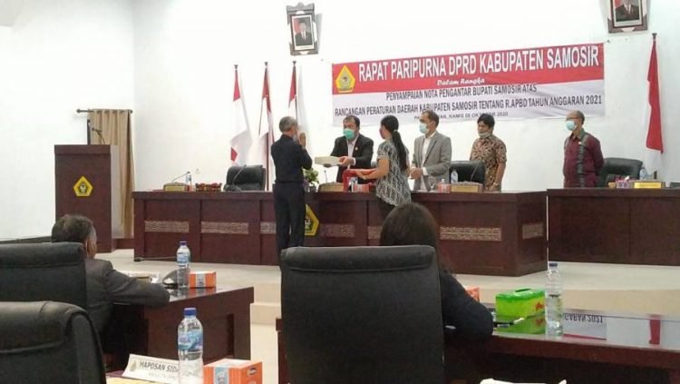 Samosir, POL | DPRD Kabupaten Samosir menggelar rapat paripurna penyampaian nota pengantar bupati Rancangan Anggaran Pendapatan Belanja Daerah (RAPBD) tahun anggaran 2021, Kamis (8/10/2020).
