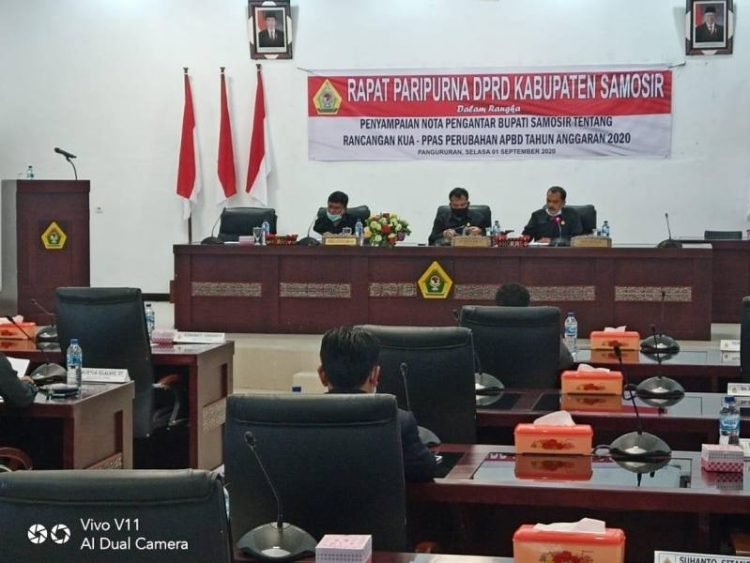 Samosir, POL | DPRD Kabupaten Samosir menggelar rapat paripurna dengan agenda penyampaian nota pengantar rancangan Kebijakan Umum Anggaran (KUA) dan Prioritas Plafon Anggaran Sementara (PPAS) perubahan APBD Tahun 2020 di ruang sidang utama kantor legislatif setempat, Selasa (1/9/2020).