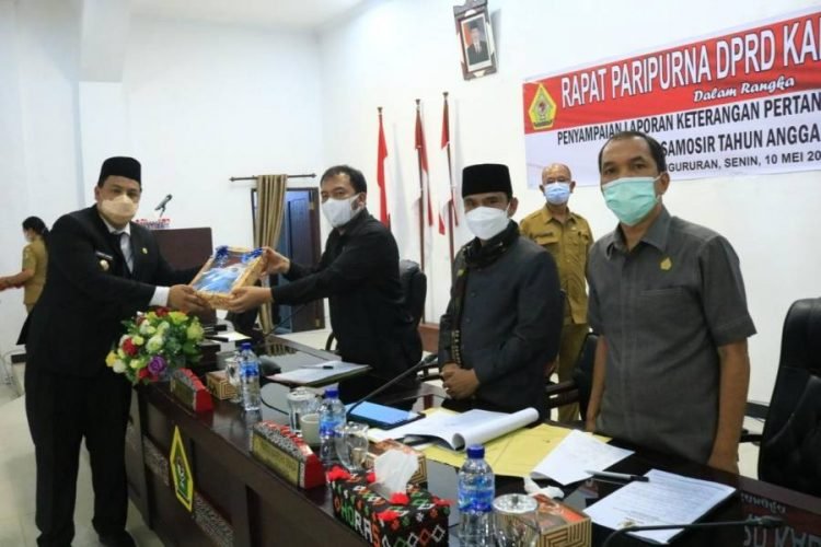 Dalam sambutannya, Ketua DPRD Samosir menyampaikan bahwa sesuai amanat UU Nomor 23 Tahun 2014 tentang Pemerintah Daerah Pasal 69 Ayat 1, disebutkan kepala daerah dan wakil kepala daerah wajib menyampaikan laporan keterangan pertanggungjawaban dan ringkasan laporan penyelenggara pemerintah daerah yang secara rinci diatur dalam peraturan pemerintah.