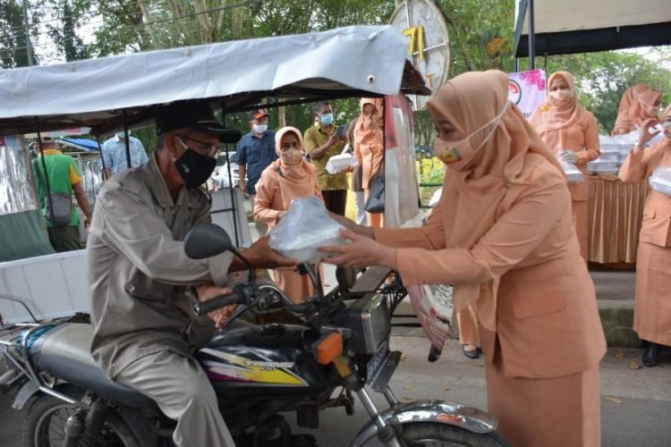 Stabat, POL | Pengurus Dharma Wanita Persatuan (DWP) Langkat, memberikan nasi berkah sebanyak 618 bungkus kepada kaum dhuafa, abang becak dan pengguna jalan yang melintas di depan Gedung Isamic Center Jl.Proklamasi Stabat, Langkat, Jum’at (5/2/2021).