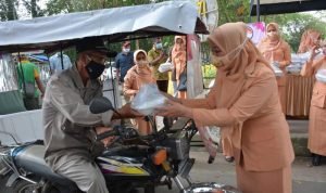 Stabat, POL | Pengurus Dharma Wanita Persatuan (DWP) Langkat, memberikan nasi berkah sebanyak 618 bungkus kepada kaum dhuafa, abang becak dan pengguna jalan yang melintas di depan Gedung Isamic Center Jl.Proklamasi Stabat, Langkat, Jum’at (5/2/2021).