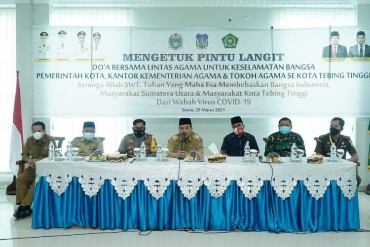 Tebing Tinggi, POL | Menindaklanjuti Surat Edaran Gubernur Sumatera Utara No. 450/2680, himbauan untuk melaksanakan doa bersama lintas Agama secara serentak menghadapi wabah pandemi Covid-19, Walikota Tebing Tinggi Ir. H. Umar Zunaidi Hasibuan, MM., menggelar doa bersama Mengetuk Pintu Langit dengan mengusung tema Semoga Allah SWT Tuhan Yang Maha Esa Membebaskan Bangsa Indonesia, Sumatera Utara dan Masyarakat Kota Tebing Tinggi dari Wabah Covid-19, bertempat di Ruang Aula Lantai IV Gedung Balai Kota (29/3/2021).