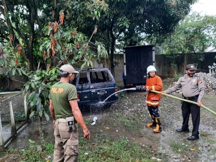 Tebing Tinggi, POL | Petugas Polres Tebingtinggi mendatangi tempat kejadian perkara (TKP) terbakarnya satu unit mobil minibus Isuzu panter warna biru tua BK 1242 YF bersera satu buah gudang/garasi, Sabtu (13/3/2021) sekira pukul 07.25 Wib.