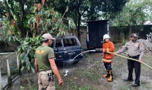 Tebing Tinggi, POL | Petugas Polres Tebingtinggi mendatangi tempat kejadian perkara (TKP) terbakarnya satu unit mobil minibus Isuzu panter warna biru tua BK 1242 YF bersera satu buah gudang/garasi, Sabtu (13/3/2021) sekira pukul 07.25 Wib.