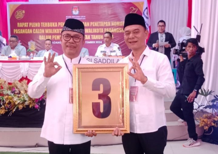 Padangsidimpuan, POL | Komisi Pemilihan umum, menggelar rapat pleno terbuka pengundian dan penetapan nomor urut pasangan calon Wali Kota dan Wakil Wali Kota Padangsidimpuan di gedung Adam Malik, jalan Serma lian kosong, kecamatan Padangsidimpuan Utara, kota Padangsidimpuan, Senin (23/09/2024).
