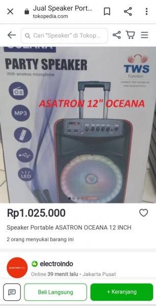 Sementara berdasarkan pengecekan secara online, di Tokopedia.com diketahui harga speaker portable merek Asatron Oceana ukuran 12 inchi ini sekitar Rp 1.025.000. Harga ini memang belum termasuk ongkos kirim. Tapi setidaknya harga yang dibandrol oleh perusahaan Elektroindo di Tokopedia.com ini menunjukkan bahwa harga satuan untuk speaker portable merek Asatron Oceana ukuran 12 inchi itu per unitnya tidak sampai Rp 1,5 juta.