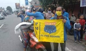 Asahan, POL | Persatuan Mahasiswa Islam Indonesia (PMII) bersama Sat Binmas Polres Asahan membagikan 100 nasi bungkus (Nasbung) dan 200 masker kepada para abang becak dan masyarakat kurang mampu di Kecamatan Simpang Empat tepatnya di jalinsum Simpang Empat, Asahan, Jumat (17/4/2020).