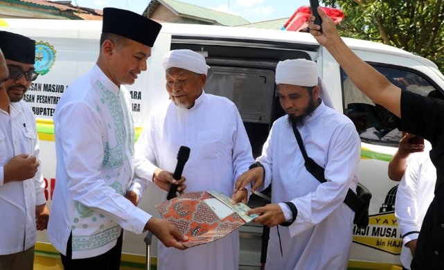 Batubara, POL | Usai meresmikan Masjid Al-Musannif di Kelurahan Indrasakti, Kecamatan Air Putih, Kabupaten Batubara, Wakil Gubernur (Wagub) Sumatera Utara (Sumut) Musa Rajekshah menyerahkan satu unit mobil ambulance dan satu unit mobil pembersih masjid gratis dari Yayasan Haji Anif (YHA), Selasa (22/8/2023).