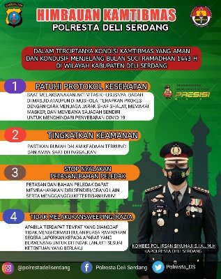 Kapolresta Deli Serdang juga menghimbau kepada masyarakat dalam menjalankan Ibadah Puasa agar selalu ingat dan mematuhi penerapan Protokol kesehatan, ujarnya, Selasa (29/03).