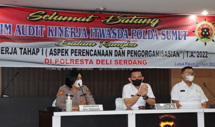 Medan, POL | Tim audit kinerja Itwasda Polda Sumut melakukan audit di Polresta Deli Serdang di Aula Tribrata Polresta Deli Serdang untuk Tahap I aspek Perencanaan dan Pengorganisasian TA 2022 , dengan penerapan Protokol Kesehatan Selasa (05/04/22).