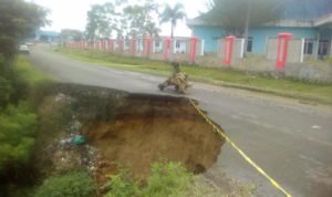 Sebab jalan ini sudah amblas 75%,hingga menjebak pengguna jalan, bahkan berdampak mengancam perkantoran di dekat longsoran ini
