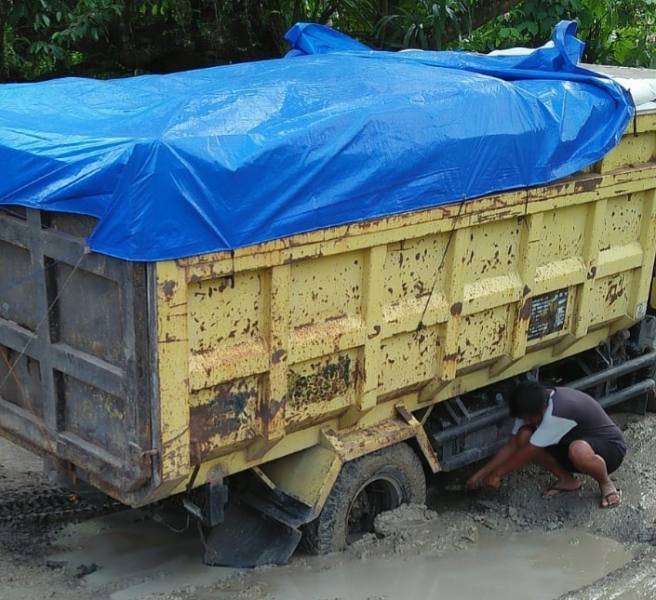 Jalan Desa Persatuan Rusak Parah, Truk Pengangkut Pupuk Terperosok Ke Lubang Berlumpur