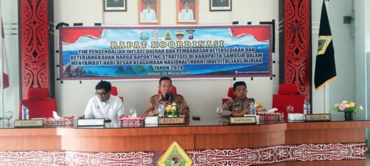 Samosir, POL | Bupati Samosir diwakili Asisten II Hotraja Sitanggang memimpin rapat tim pengendali inflasi daerah (TPID) di Aula Kantor Bupati Samosir, Selasa (26/03/2024). Rakor TPID dilakukan dalam rangka menyambut Hari Besar Keagamaan Nasional (HKBN) Idul Fitri 1445 H untuk menjaga stabilitas dan keterjangkauan harga, menjaga ketersediaan pasokan, kelancaran distribusi dan menjalin komunikasi yang efektif.