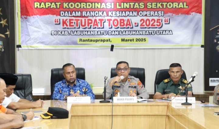 Rantauprapat, POL | Menjelang Hari Raya Idulfitri 1446 H, Polres Labuhanbatu menggelar Rapat Koordinasi Lintas Sektoral dalam rangka kesiapan Operasi Ketupat Toba 2025. Rapat yang berlangsung di Aula Tunggal Panaluan Mapolres Labuhanbatu yang melibatkan berbagai unsur terkait, termasuk TNI, Pemkab Labuhanbatu dan Labuhanbatu Utara, serta stakeholder lainnya.