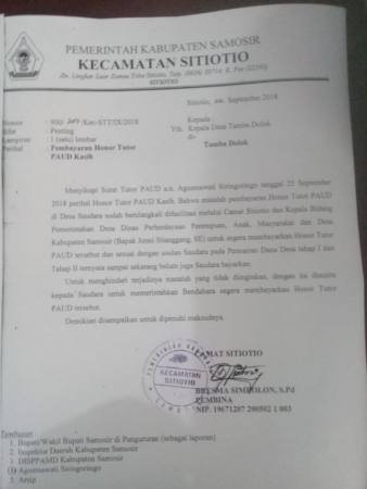 “Melalui surat saya kepada Camat Sitiotio tertanggal 25 September 2018 lalu, saya sudah sampaikan keluhan saya bahwa sampai saat ini honor yang menjadi hak saya sebagai tutor Paud belum saya terima,” kata Agusmawati Siringoringo, Senin (15/10/2018).