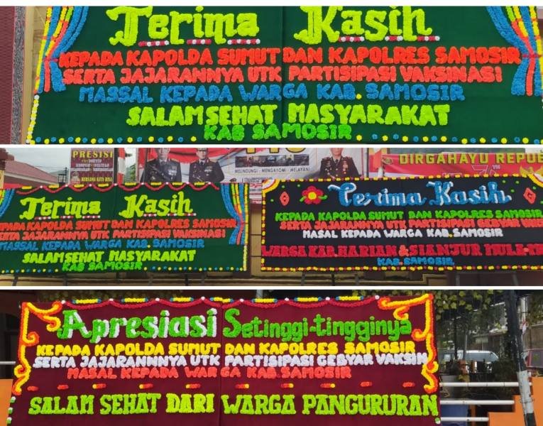 “Apresiasi setinggi-tingginya kepada Kapolda Sumut dan Kapolres Samosir serta jajarannya atas pelaksanaan gebyar vaksinasi massal kepada warga Kabupaten Samosir,” tulis warga menyampaikan apresiasi di papan bunga.