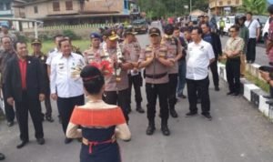 Sesaat turun dari heli, Kapolda Sumut, Irjen Pol Drs. Martuani Sormin M.Si disambut dengan tarian khas Batak Toba yang dibawakan oleh sanggar tari Angel Lean dan pengalungan bunga oleh Bupati Samosir, didampingi Kapolres Samosir, AKBP Muhammad Saleh S.I.K. MM.
