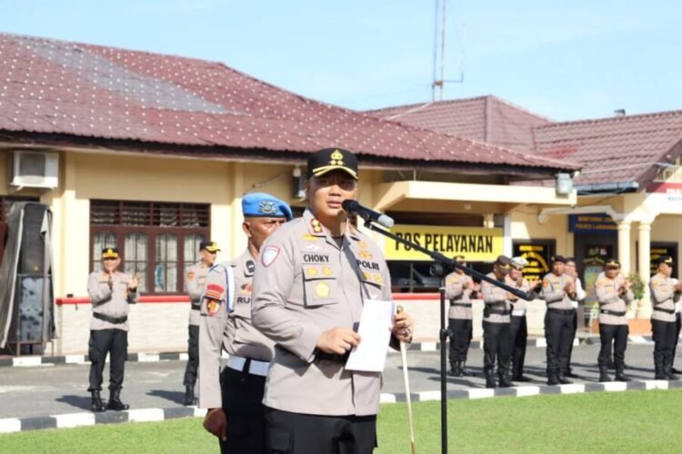 Rantauprapat, POL | Kapolres Labuhanbatu AKBP Choky Sentosa Meliala, S.I.K., S.H., M.H., memimpin langsung upacara serah terima jabatan (Sertijab) sejumlah Pejabat Utama dan Kapolsek jajaran Polres Labuhanbatu, Senin (13/10/2025) pukul 08.00 WIB di halaman apel Mapolres Labuhanbatu, Jalan MH. Thamrin No.7 Rantauprapat.