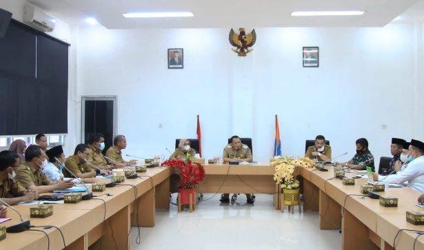 Labuhanbatu, POL | Bupati Labuhanbatu H Erik Adtrada Ritonga didamping Wakil Bupati Hj Ellya Rosa Siregar memimpin rapat dalam persiapan melaksanakan Musabaqoh Tilawatil Qur’an (MTQ) ke-51 dan Festival Seni Qasidah ke-36 tingkat Kabupaten Labuhanbatu di ruang rapat bupati, Selasa (11/01/2022).