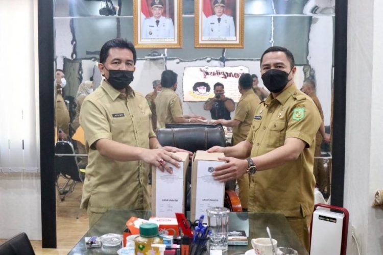 Medan, POL | Kepala Badan Kepegawaian Daerah dan Pengembangan Sumber Daya Manusia (BKDPSDM) Kota Medan Zain Noval menyerahkan arsip inaktif Kantor Pendidikan dan Pelatihan Kota Medan kepada Kepala Dinas Perpustakaan dan Kearsipan Adlan, Selasa (12/10/2021).
