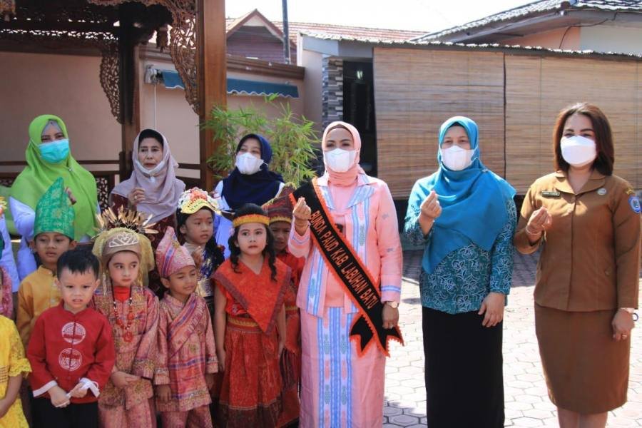 Labuhanbatu, POL l Ketua Tim Penggerak PKK Kabupaten Labuhanbatu dr.Hj. Maya Hasmita, SpOG memberikan tetes vitamin A secara simbolis kepada anak-anak usia dini, di halaman rumah Bupati Labuhanbatu Kelurahan Padang Matinggi Kecamatan Rantau Utara, Selasa (8/2/2022).