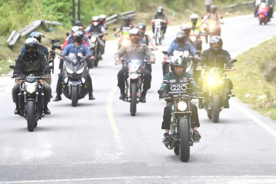 Tampak Menteri Koordinator Bidang Kemaritiman dan Investasi Luhut Binsar Pandjaitan, Menteri Pekerjaan Umum dan Perumahan Rakyat Basuki Hadimuljono, serta Menteri Pariwisata dan Ekonomi Kreatif Sandiaga Uno turut menaiki sepeda motor masing-masing.
