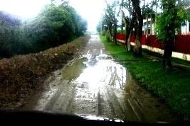 Terlihat dalam foto, jalan aspal hotmix menjadi kubangan dan air tergenang, yang dimungkinkan cenderung merusak aspal hotmix di kawasan perkantoran itu karena air tergenang akibat timbunan tanah di sisi jalan.
