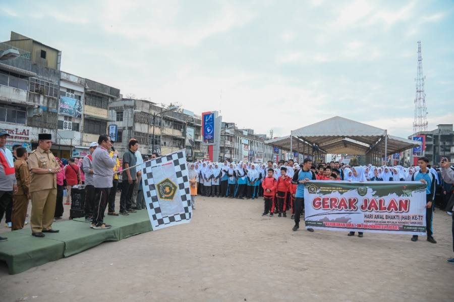 Padangsidempuan, POL | Memeriahkan Hari Amal Bhakti (HAB) ke- 77, Kementerian Agama (Kemenag) Kota Padangsidempuan laksanakan gerak jalan diikuti pengelola dan siswa Ibtidaiyah (MI), Tsanawiyah (MTs) dan Madrasah Aliyah (MA) di kota tersebut.