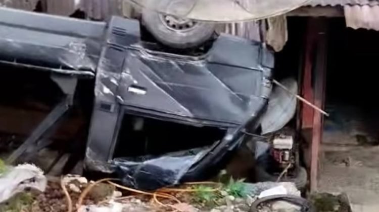 Dairi, POL | Mobil L300 pick up tanpa muatan terguling menimpa rumah setelah menabrak mobil parkir. Akibatnya, rumah dan mobil pribadi milik marga Banjarnahor, hancur, Minggu (9/3/2025) sekitar pukul 7.00 WIB.