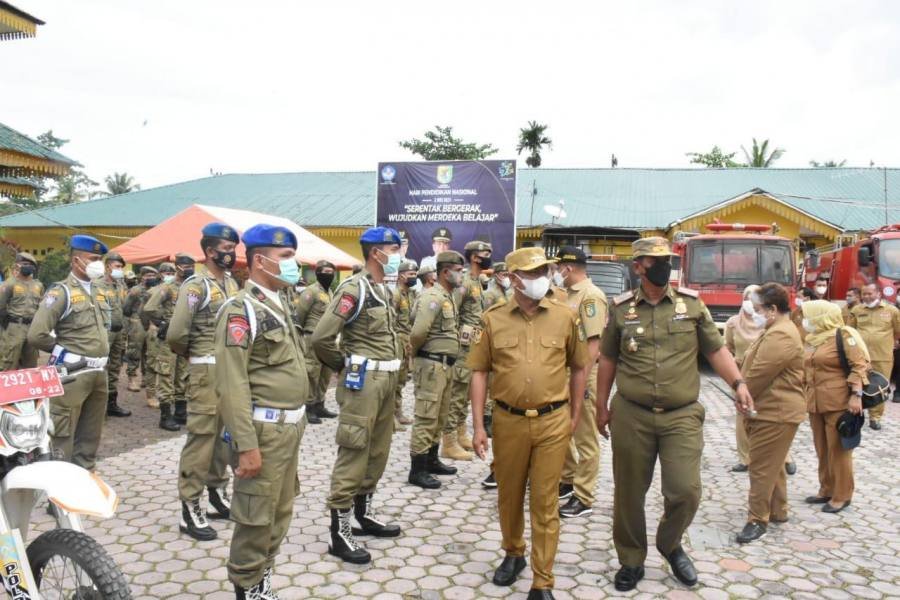 Sei Rampah, POL | Hari pertama kerja pasca libur hari raya Idulfitri 1442 H/2021, Pemerintah Kabupaten Serdang Bedagai (Pemkab Sergai) melaksanakan Apel Gelar Pasukan Personil Satuan Polisi Pamong Praja (Satpol PP) di Lapangan Apel Kompleks Kantor Bupati Sergai, Sei Rampah, Senin (17/5/2021).