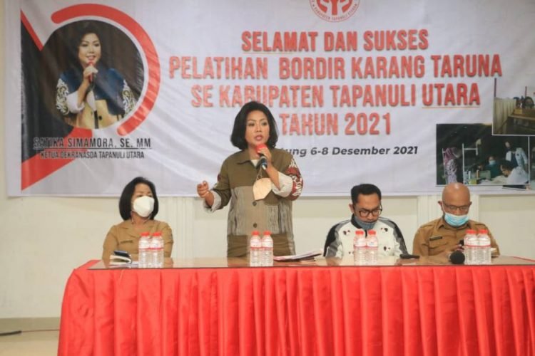 Tarutung, POL | Pelatihan Bordir Karang Taruna se-kabupaten Tapanuli Utara dilaksanakan di pendopo rumah dinas Bupati Taput,Tarutung ,Senin (07/12/2021). Acara tersebut dibuka Ketua Dekranasda Satika Simamora,SE,MM bersama desainer nasional Aery Arka .