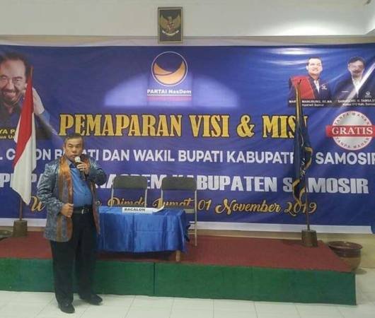 Samosir, POL | Setelah melewati tahapan penjaringan bakal Calon (Balon) Bupati dan Wakil Bupati Samosir beberapa waktu lalu, Kini Dewan Perwakilan Daerah (DPD) Partai Nasional Demokrat (NasDem) Kabupaten Samosir menggelar kegiatan penyampaian visi dan misi para bakal calon, Jumat (1/11/2019).