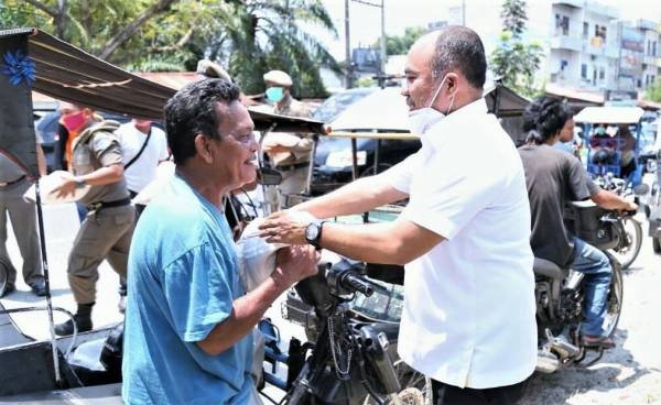 Rantauprapat, POL | Bupati Labuhanbatu H Andi Suhaimi Dalimunthe secara langsung memberikan sembako kepada para pengemudi becak di sepanjang jalan SM Raja menuju pusat kota Rantauprapat, Rabu (15/4/2020).