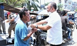 Rantauprapat, POL | Bupati Labuhanbatu H Andi Suhaimi Dalimunthe secara langsung memberikan sembako kepada para pengemudi becak di sepanjang jalan SM Raja menuju pusat kota Rantauprapat, Rabu (15/4/2020).