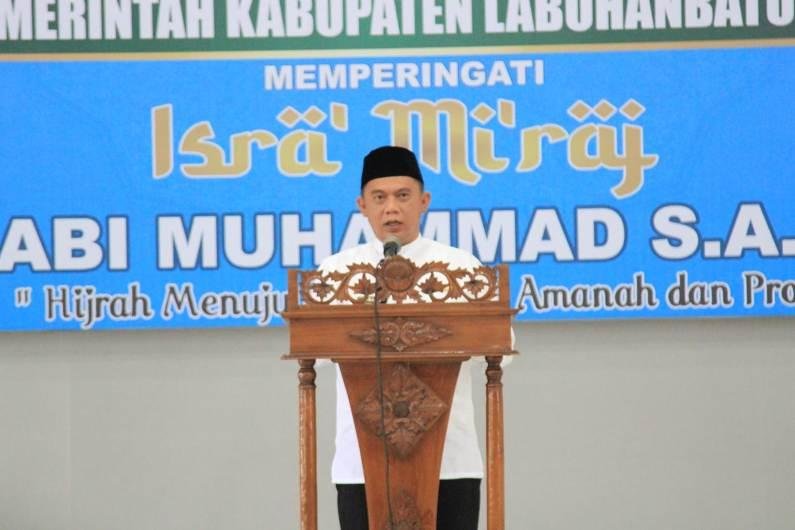 “Untuk itu mari kita tetap bersyukur masih bisa melaksanakan peringatan Isra’ Mi’raj Nabi Muhammad SAW,” ucap Bupati Labuhanbatu.