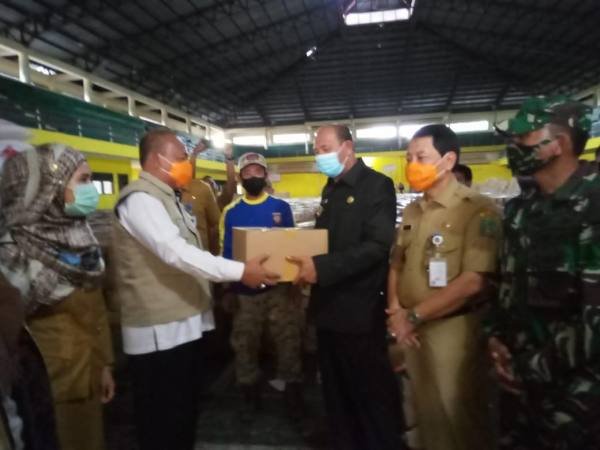 Stabat, POL | Pemerintah Kabupaten Langkat menerima Bantuan Sosial (Bansos) berupa sembako pangan untuk penanggulangan covid 19 dari Pemerintah Provinsi Sumatera Utara, di Gedung Gor Stabat, Selasa (19/5/2020).