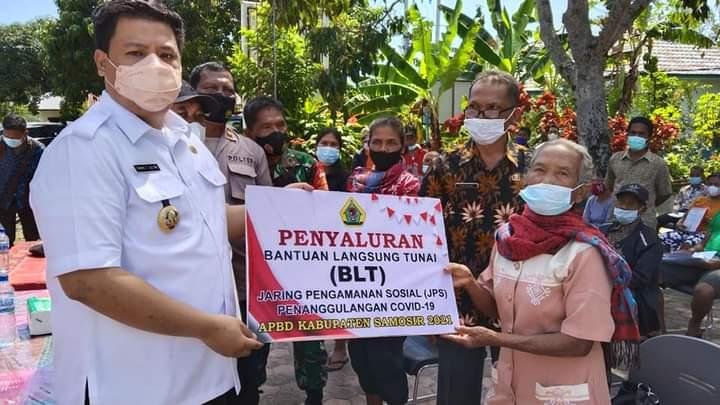 Samosir, POL | Bupati Samosir Vandiko T. Gultom menyerahkan bantuan langsung tunai (BLT) untuk 6 kelurahan se-Kabupaten Samosir. Penyaluran perdana dilakukan di Kecamatan Nainggolan, Rabu (21/07/2021).